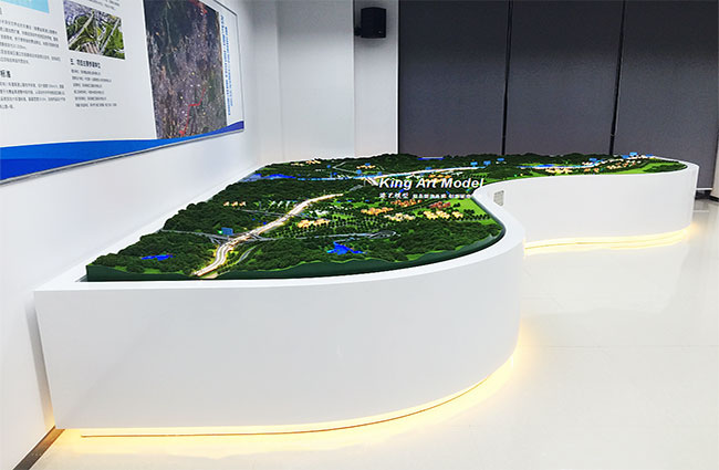 周邊住宅和廠房上也寫實精細制作,分別設置燈光,景觀周邊山體寫實制作,種植綠化樹叢底部設計顏色不同的LED小彩燈,使整個沙盤更加豐富,逼真的效果。