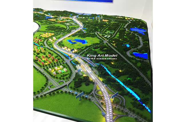 港藝人為了能夠在模型上更好體現惠鹽高速作為“十橫十三縱”高快速路網之一,雙層復合通道寫實制作,更清楚表達上層立體通道與下層地面通道之間轉換關系。
