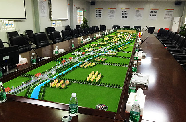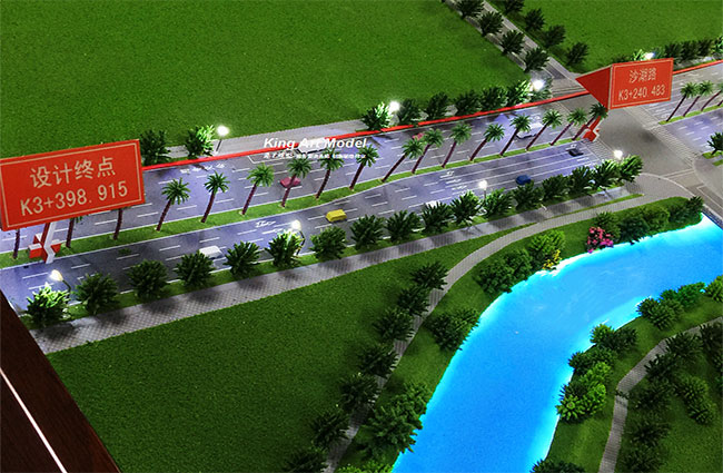 港藝公司根據坪山大道南段“青山環繞,水抱城流,園道格致,城景和一”的設計理念。展示全路段每個項目部的所在位置,項目部及周邊建筑均采用寫實制作手法,設置不同的燈光效果,并分組進行控制。在項目部、重點建筑、主要橋梁、起點和終點都設置了精美的標示牌。景觀周邊水系、綠植、采用寫實制作,種植綠化和設置燈光,使整個沙盤更加豐富逼真,還原城市真實場景。