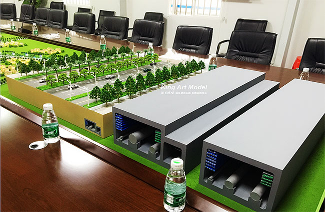 在道路路面上,港藝設計了各式車輛,小汽車、大巴車、公交專用車道等路線行駛車道,還原道路真實場景。同時重要路段及地下管廊功能,做了剖面示意展示,便于施工中對項目的精準的推敲。